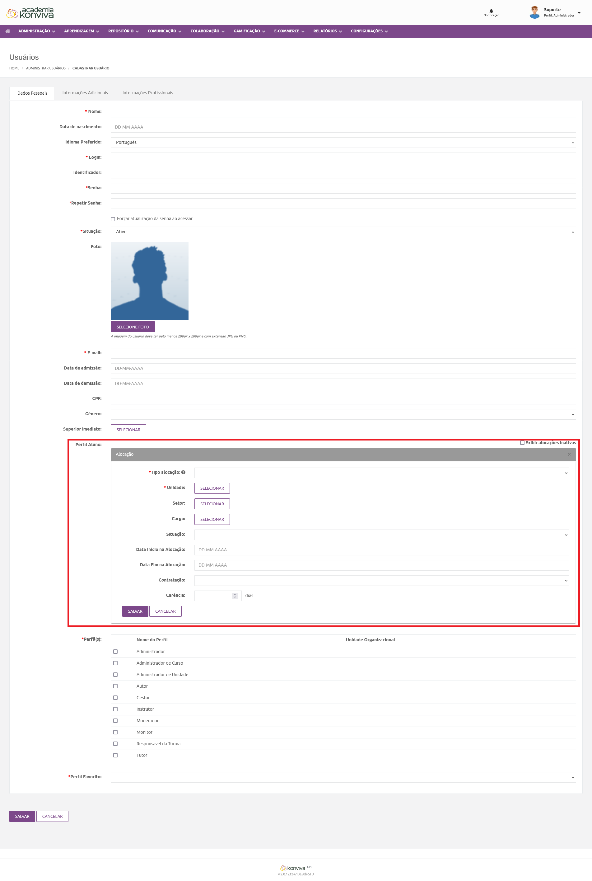 Com a função habilitada, agora estará disponível no cadastro dos usuários a opção "Perfil Aluno:" conforme a imagem: