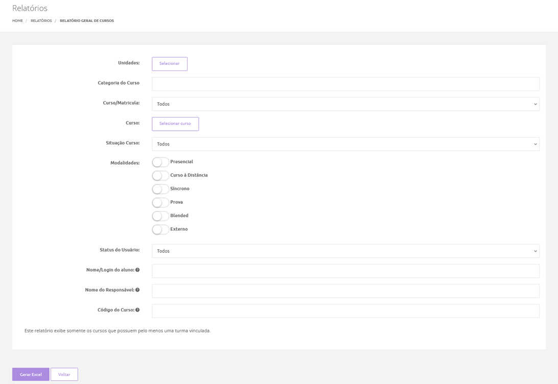 Situação: Estado atual do curso (ativo ou inativo).