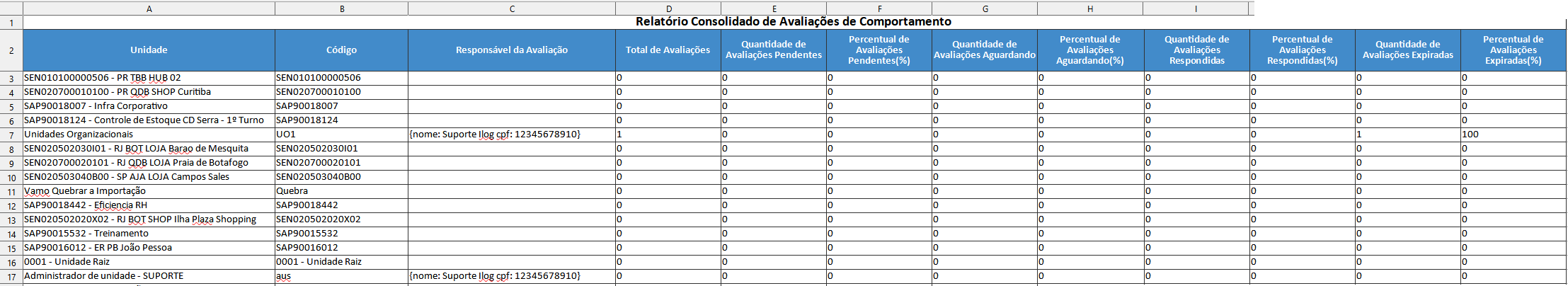 Este relatório extrai os dados da: Unidade, Código da Unidade, Responsável da Avaliação, Total de Avaliações, Quantidade de Avaliações Pendentes, Percentual de Avaliações Pendentes, Quantidade de Avaliações Aguardando, Percentual de Avaliações Aguardando, Quantidade de Avaliações Respondidas, Percentual de Avaliações Respondidas, Quantidade de Avaliações Expiradas e Percentual de Avaliações Expiradas.