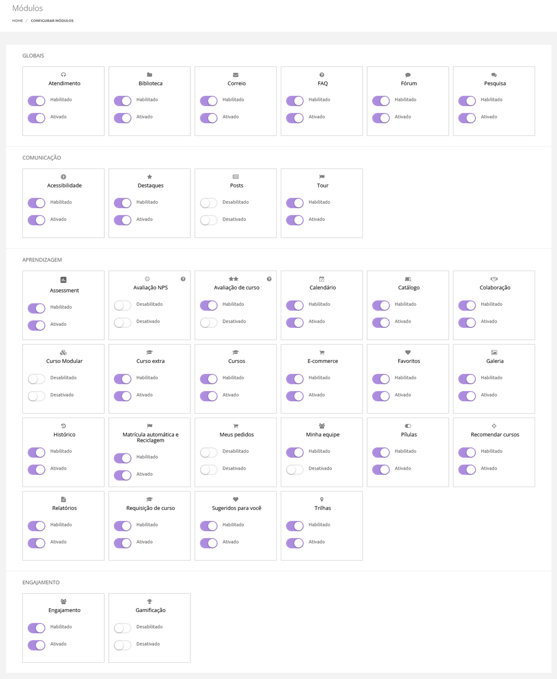 Em módulos o administrador conseguirá ativar ou desativar um módulo no ambiente.