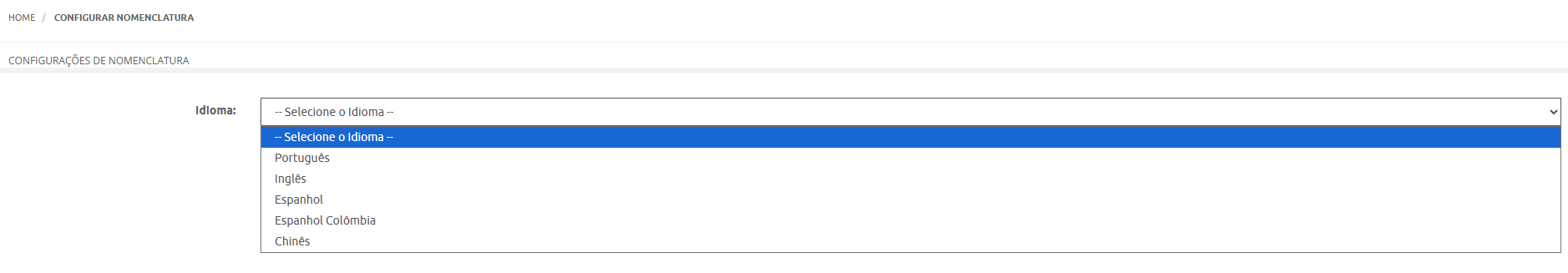 Nesta primeira etapa você deve selecionar em qual idioma você quer alterar a nomenclatura.