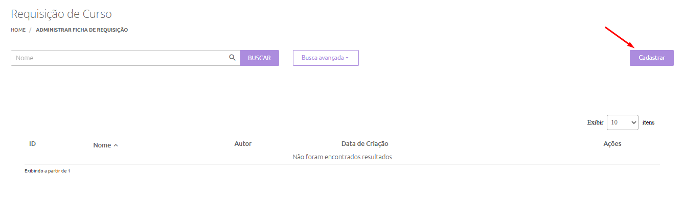 Criando uma nova requisição de curso, clicando em Cadastrar: