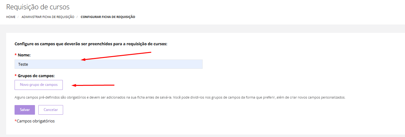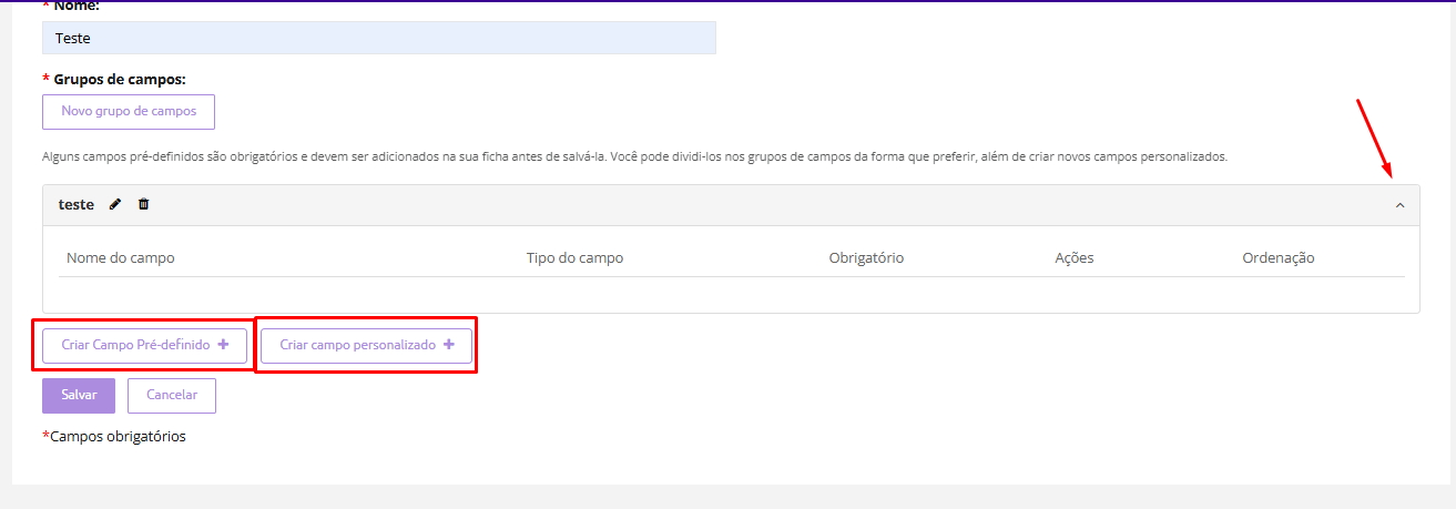 Você terá que preencher os campos obrigatórios, como o Nome, Grupos de campos: