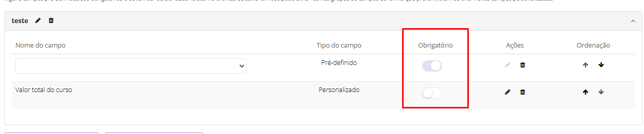 Ao criar um campo personalizado, você pode definir se ele será obrigatório ou opcional.