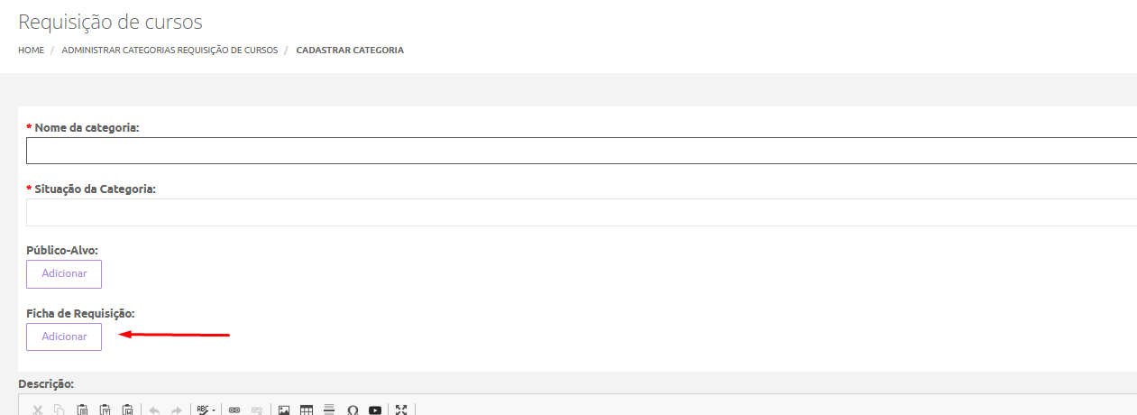 Para isso, o administrador deve cadastrar previamente as categorias disponíveis para que as requisições possam ser cadastradas. Para cadastrar uma categoria, basta acessar o menu Aprendizagem > Requisição de cursos > Categorias e informar os dados solicitados.