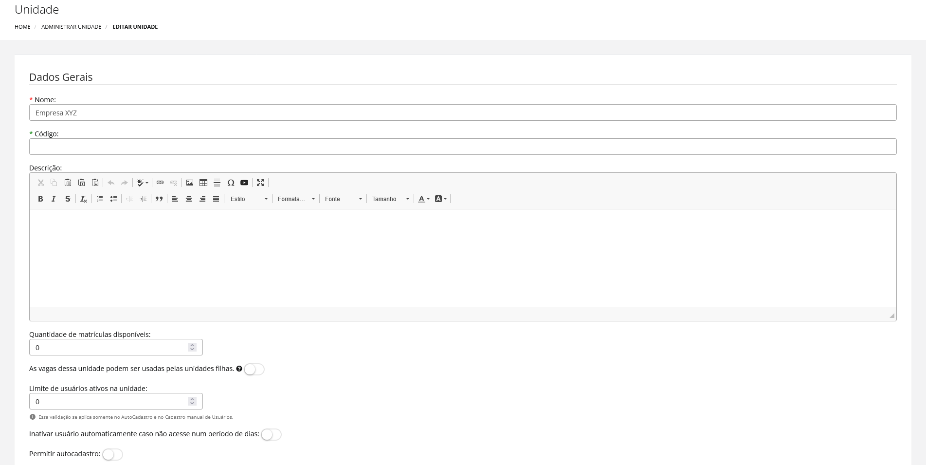 - Nome: o nome da unidade, geralmente, é fornecido pelo próprio RH da empresa que está utilizando o ambiente de aprendizagem. É um campo obrigatório.