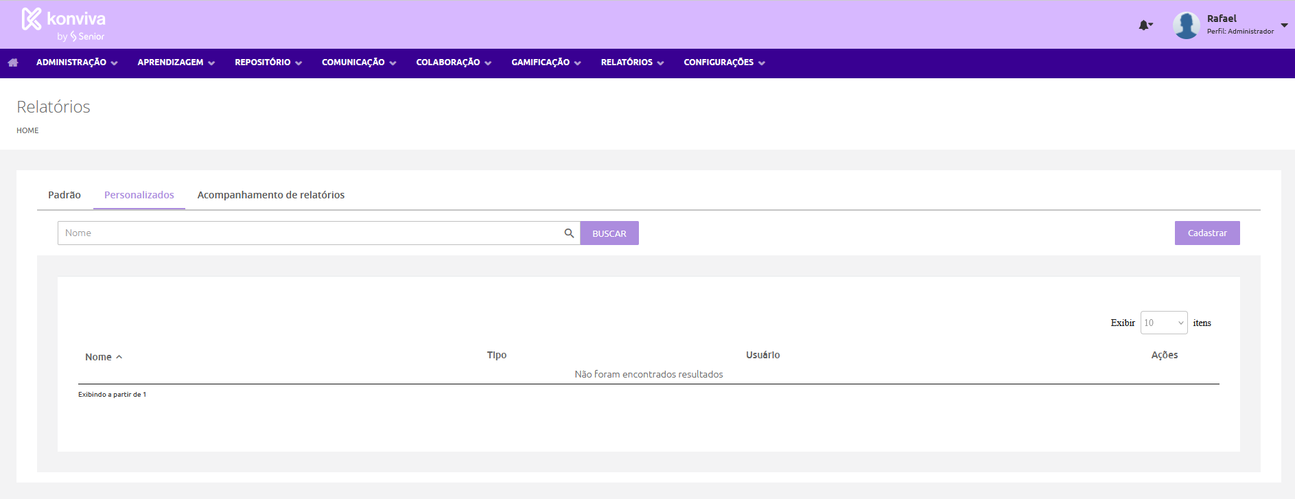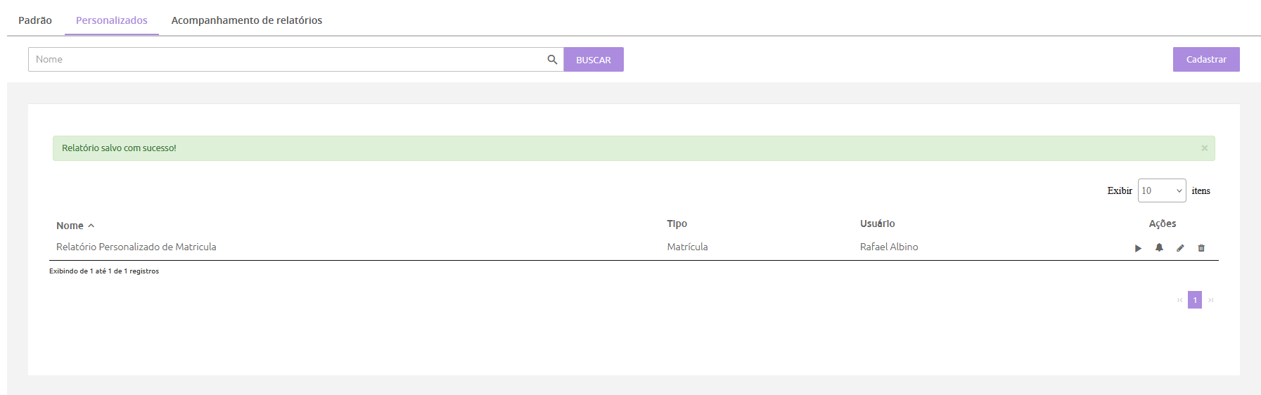 Para criar um relatório personalizado, clique no botão “Cadastrar”.