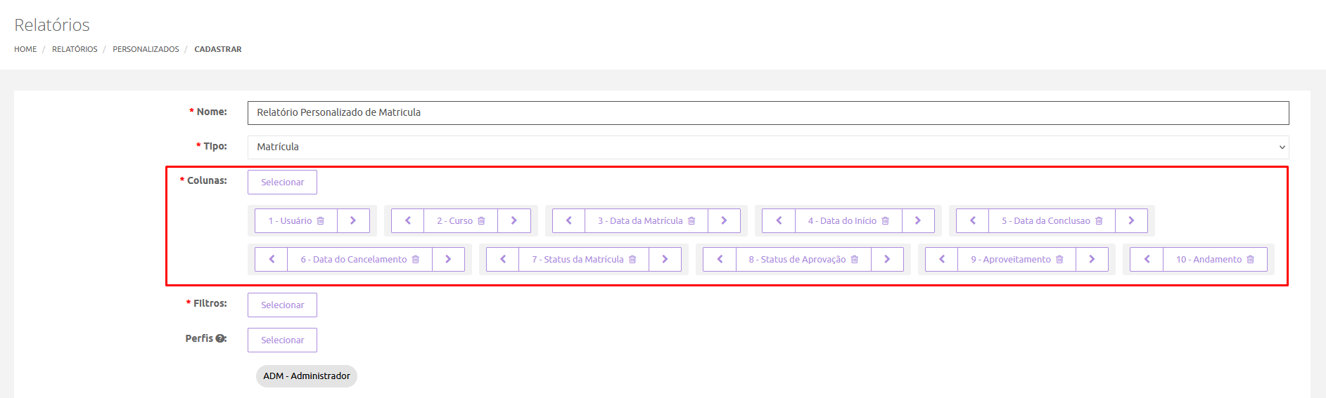 Em Colunas você deve selecionar as colunas que aparecerão no seu relatório. Essas colunas podem variar de acordo com o tipo de relatório selecionado. Por exemplo, no relatório do tipo Matrícula, você pode selecionar campos com informações do Usuário, Curso, Turma e Matrícula.