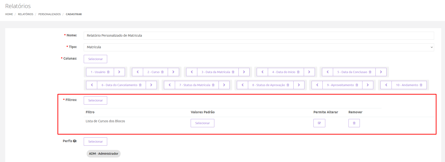 Como utilizamos o relatório do tipo matrícula como exemplo, neste caso, adicionamos o filtro "Lista de Cursos dos Blocos", assim podemos selecionar o curso, e o relatório nos trará a informação de todas as matrículas referentes ao cursos selecionados.