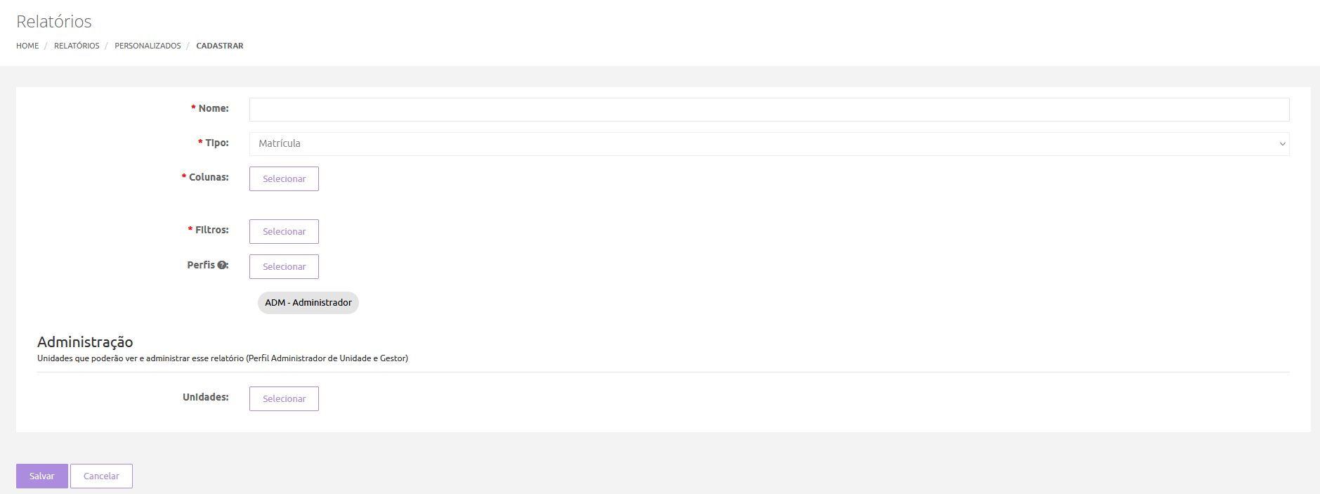 O Relatório Personalizado permite que o administrador cadastre novas combinações de acordo com a sua necessidade.