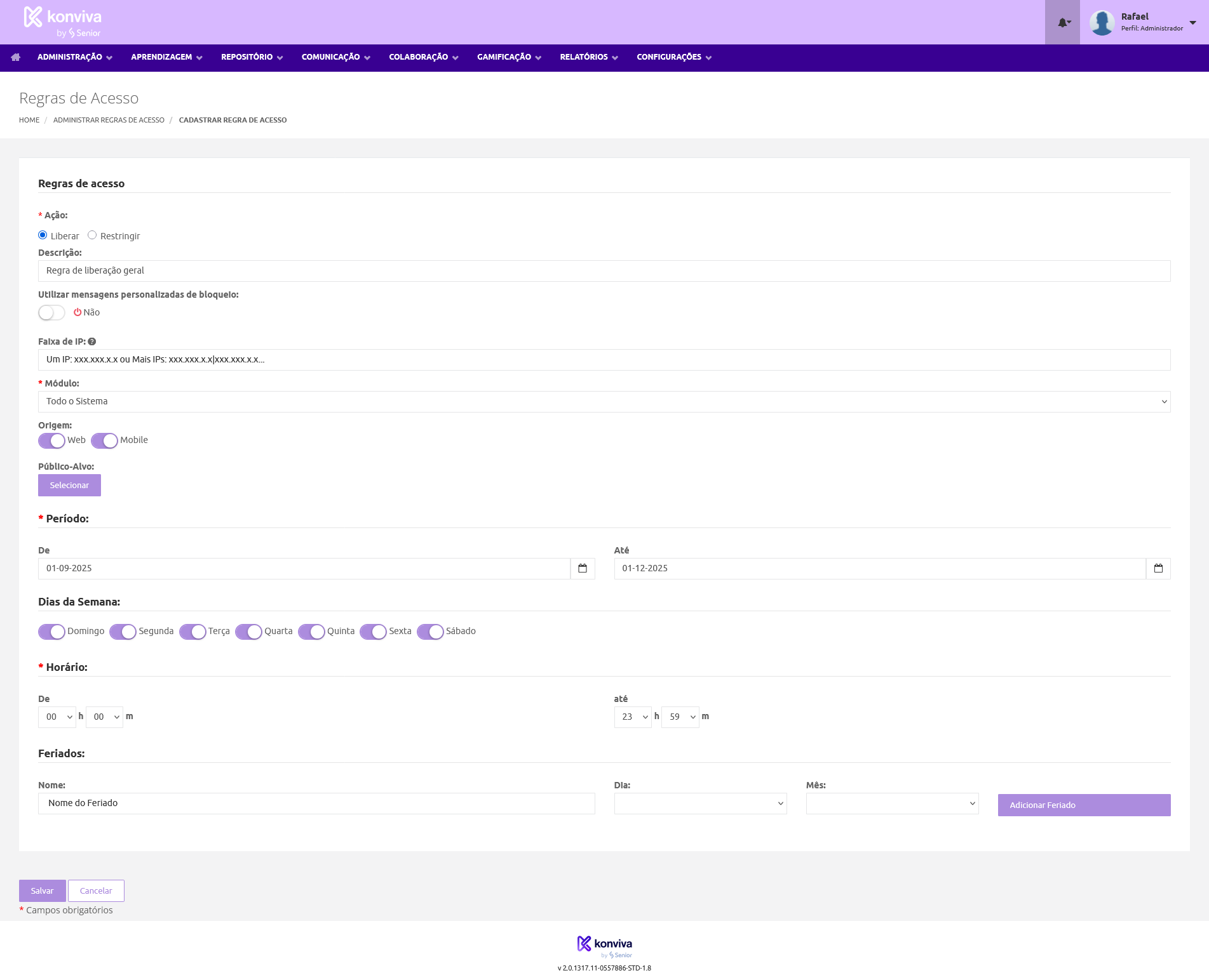 - Período: você pode delimitar o período de acesso em um intervalo de dias;