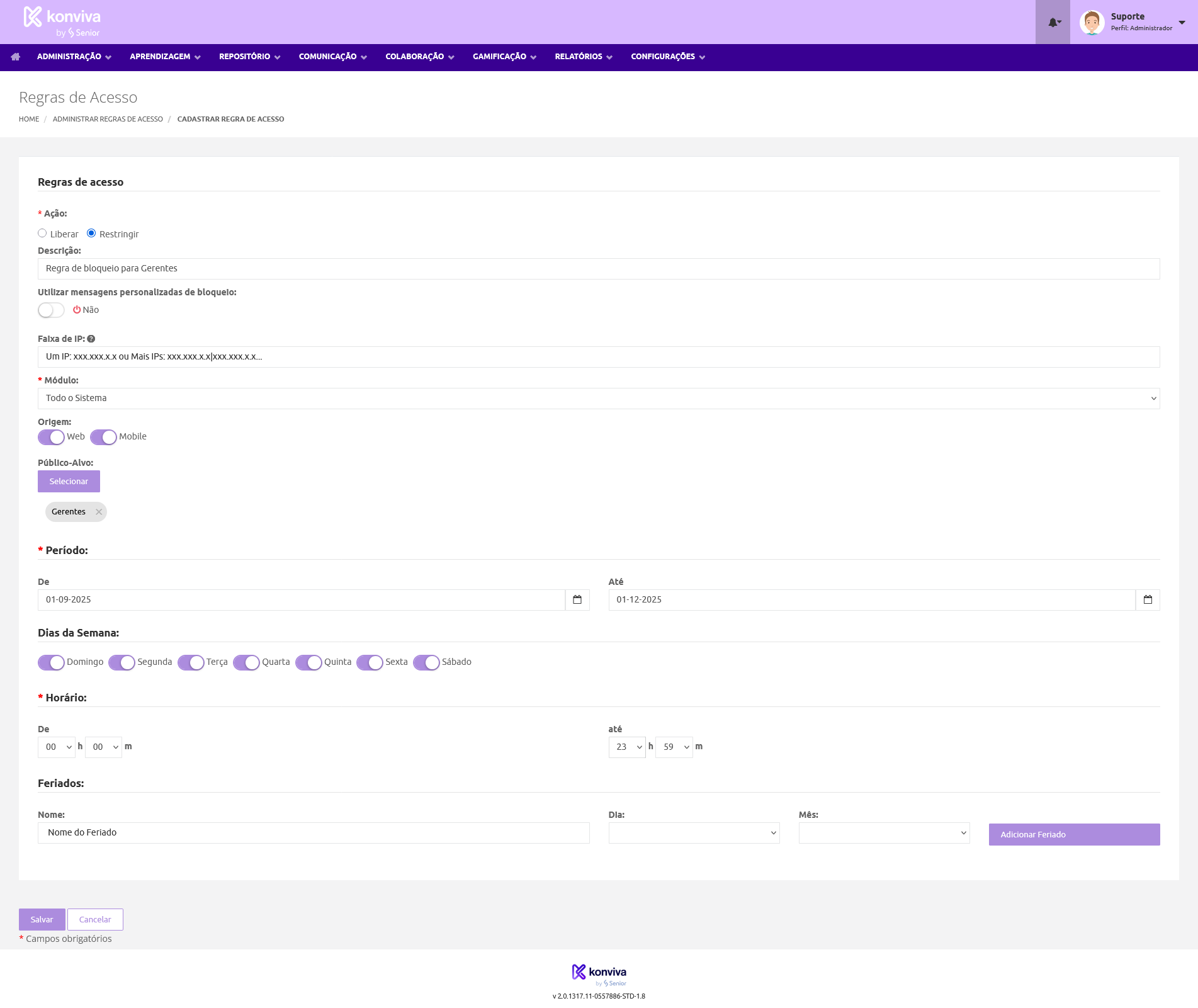 - Horário: delimita o período em horas em que a restrição ou liberação deverá ser aplicada;