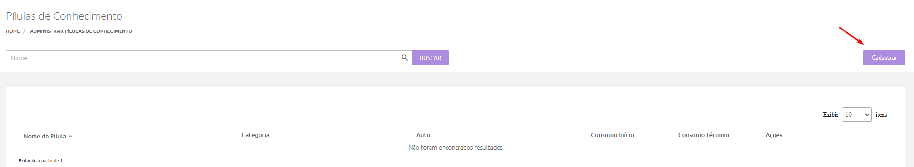 Para cadastrar uma pílula, você precisa ter o perfil de administrador e acessar o menu Aprendizagem > Pílulas de Conhecimento > Administrar.
