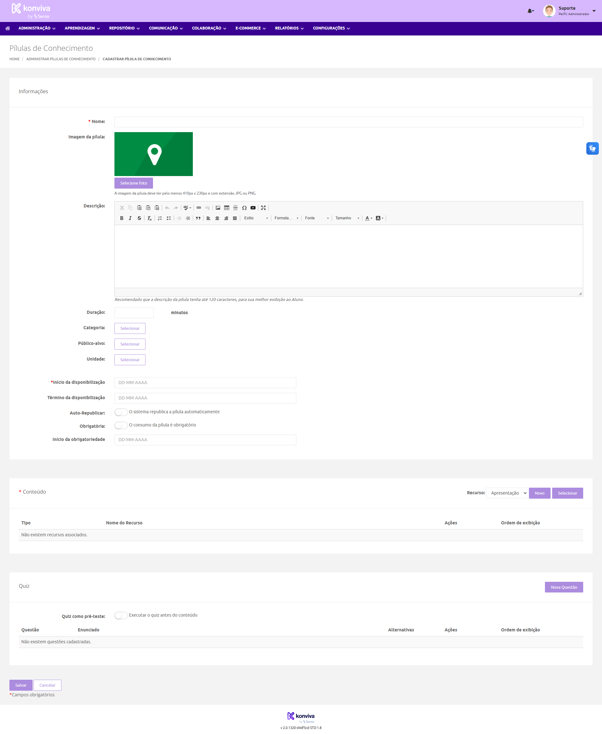 Ao clicar em cadastrar, irá abrirá um formulário onde os campos estão agrupados em: Informações (são os campos gerais de configuração da pílula), Conteúdo (são os recursos de aprendizagem que comporão a pílula) e Quiz (são os testes que você pode aplicar na pílula).