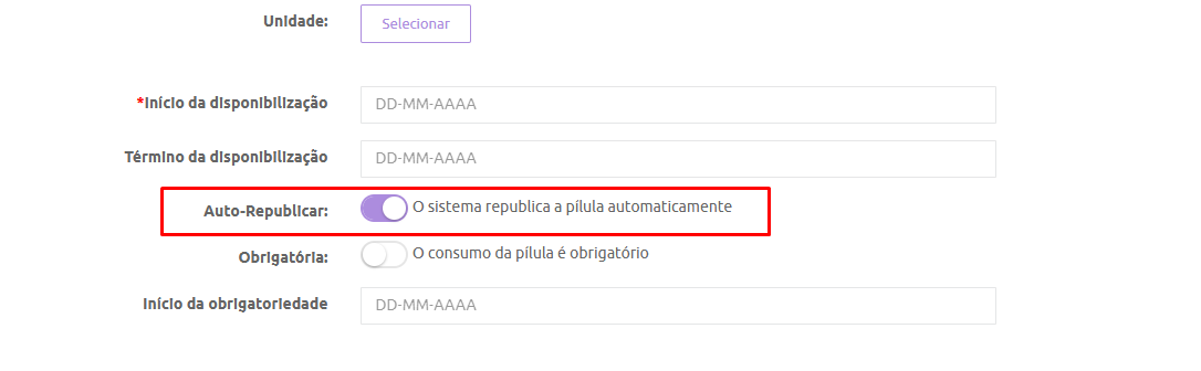 Logo abaixo você poderá definir uma data de início e fim para que ela fique disponível e caso você opte por não definir uma data, a pílula ficará sempre disponível até que o consumo seja realizado.