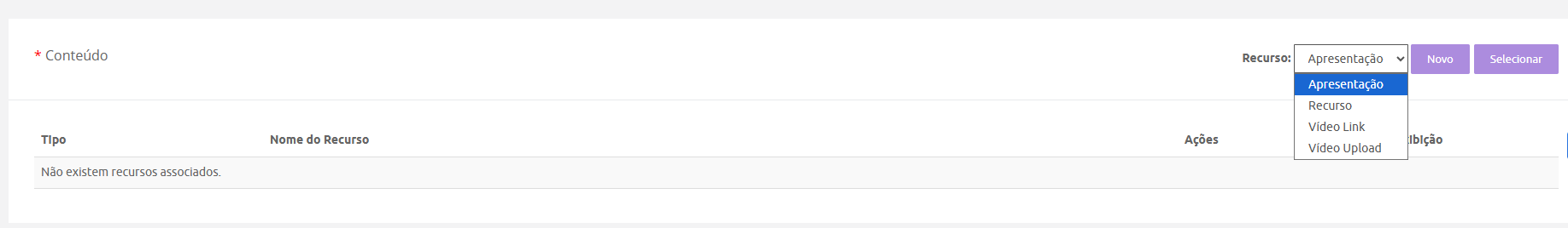 Neste grupo de informações você precisa escolher o tipo de recurso de aprendizagem e em seguida decidir se cadastrará um novo ou se reutilizará algum conteúdo que já se encontra no repositório. A forma de cadastrar os recursos de aprendizagem seguem o mesmo padrão do Konviva. Contudo, na pílula, você pode inserir apenas 4 tipos de recursos. São eles: Apresentação, que são os power points e PDF, Recursos, Vídeo Link e Vídeo Upload.