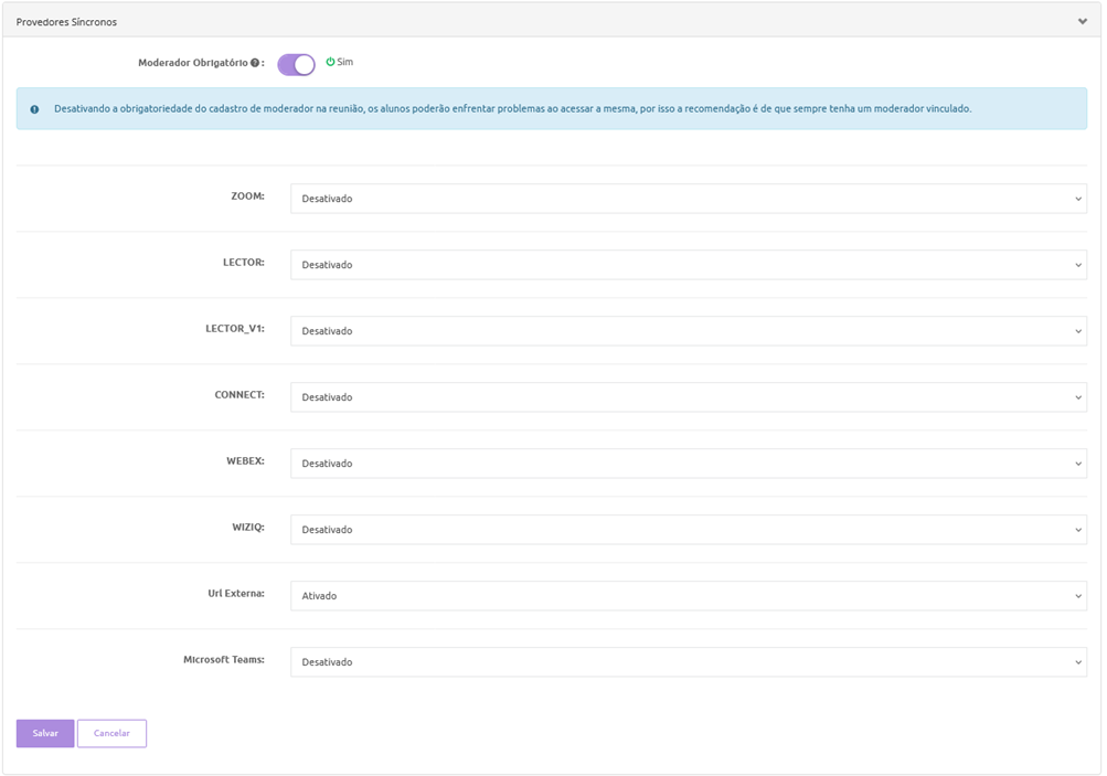 Na Konviva, em Provedores Síncronos, é possível realizar a integração com sistemas externos de web conferência.