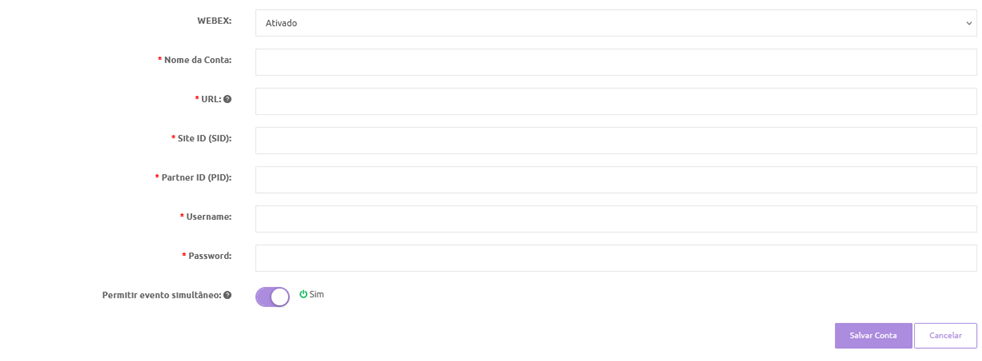 - WebEx Site ID (SID) e Partner ID (PID): informações da conta que devem ser preenchidas.