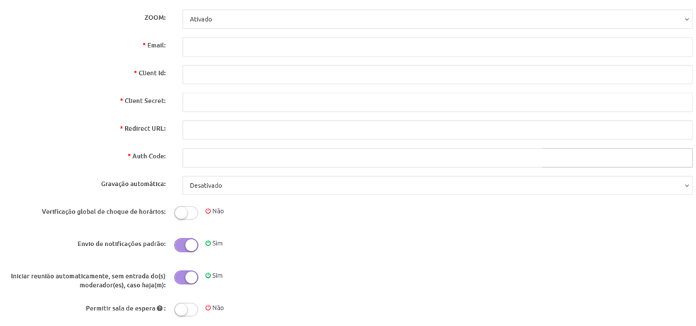 - Gravação: neste campo você pode selecionar se quer ou não que as sessões sejam gravadas.