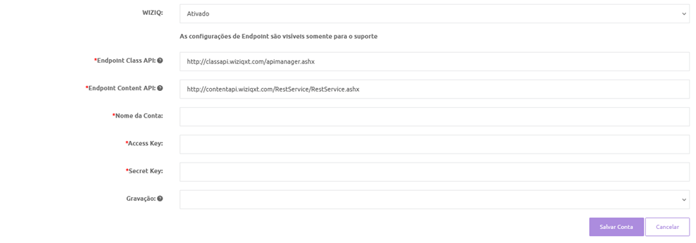 - Access Key: neste campo deve ser inserido a chave de acesso da WizIQ fornecida pelo administrador da plataforma ou a empresa contratante.