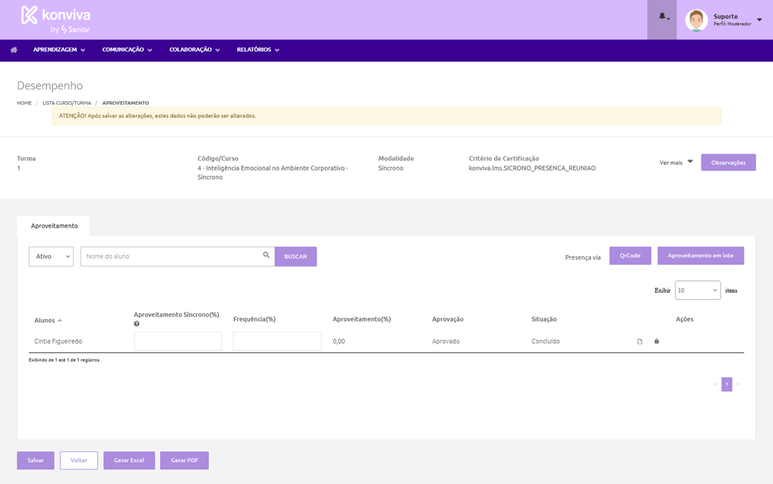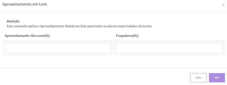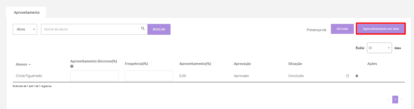 O moderador também pode atribuir aproveitamento em lote, o que faria com que todos os alunos matriculados recebessem a mesma nota de uma única vez. Para isso, basta que acesse "Aproveitamento em lote":