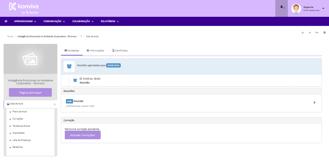 Clicando nesse botão o moderador é direcionado à sala de aula, onde consegue ver conteúdos e a reunião agendada, corrige avaliações pendentes, interage com os alunos quando existem ferramentas habilitadas, acessa relatórios. Segue visualização quando clicado: