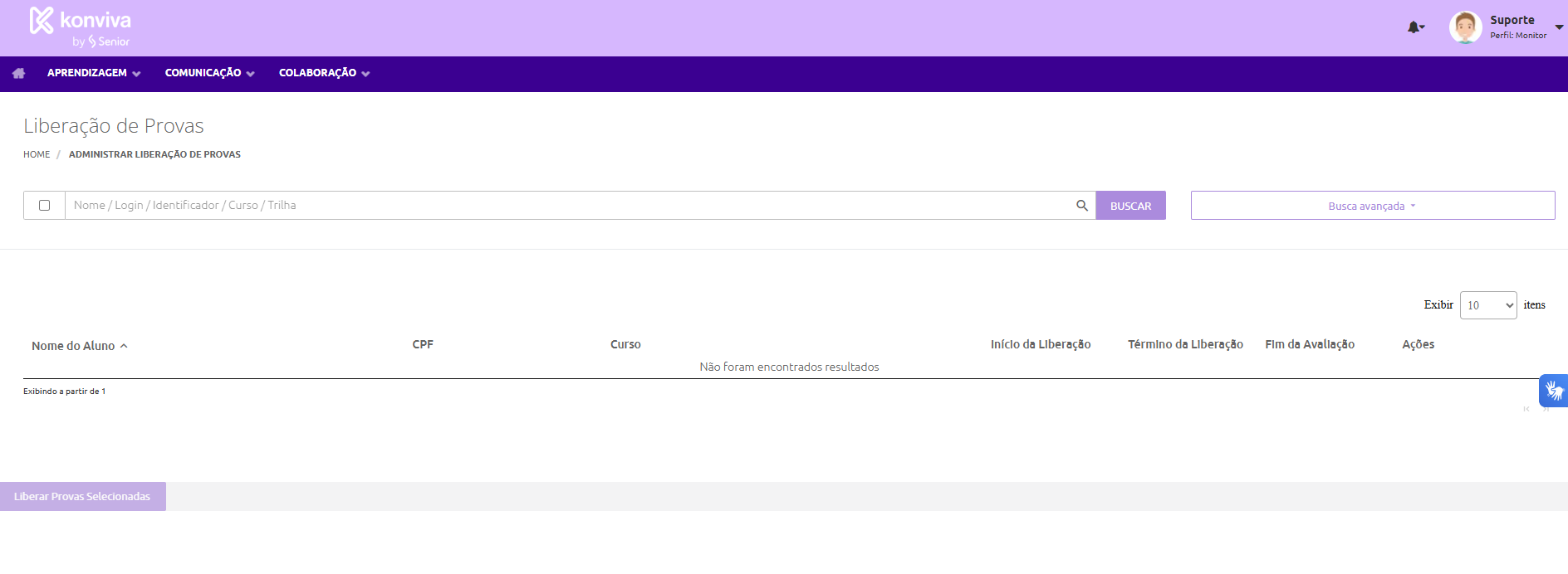 A liberação da prova deve ser feita pelo Monitor somente quando a turma foi configurada com a opção “Necessita liberação” ativada.