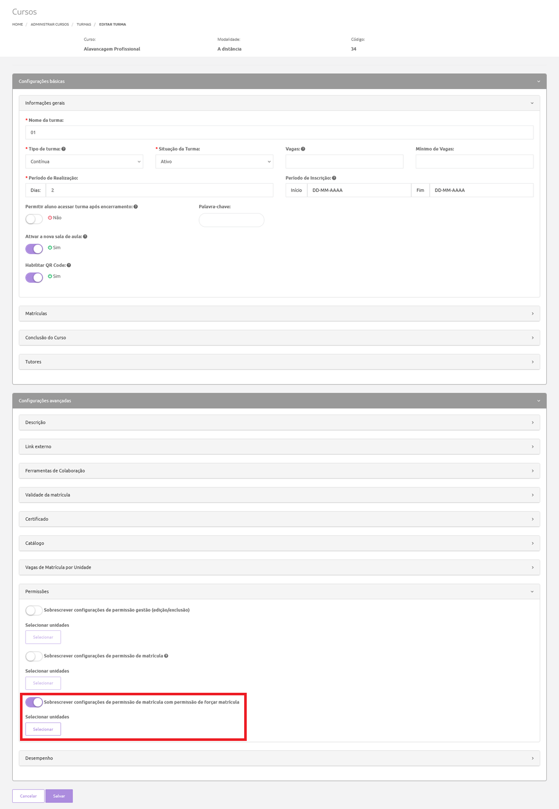 Importante: Para que o Administrador de Unidade visualize e utilize o botão Forçar Matrícula, é necessário que a turma esteja configurada para a sua Unidade, na opção “Sobrescrever configurações de permissão de matrícula com permissão de forçar matrícula”, conforme demonstrado na imagem abaixo: