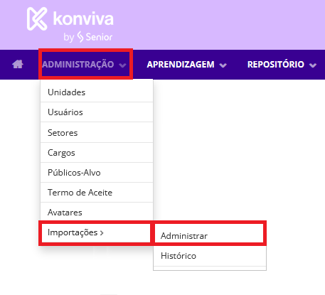 Para realizar uma importação você deve acessar o menu Administração > Importações > Administrar