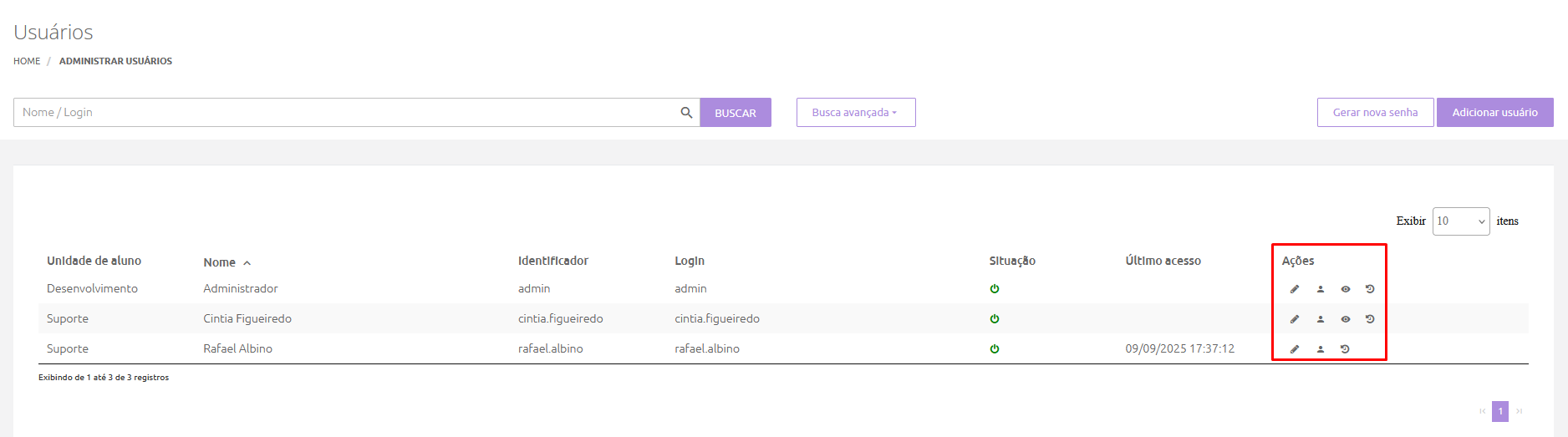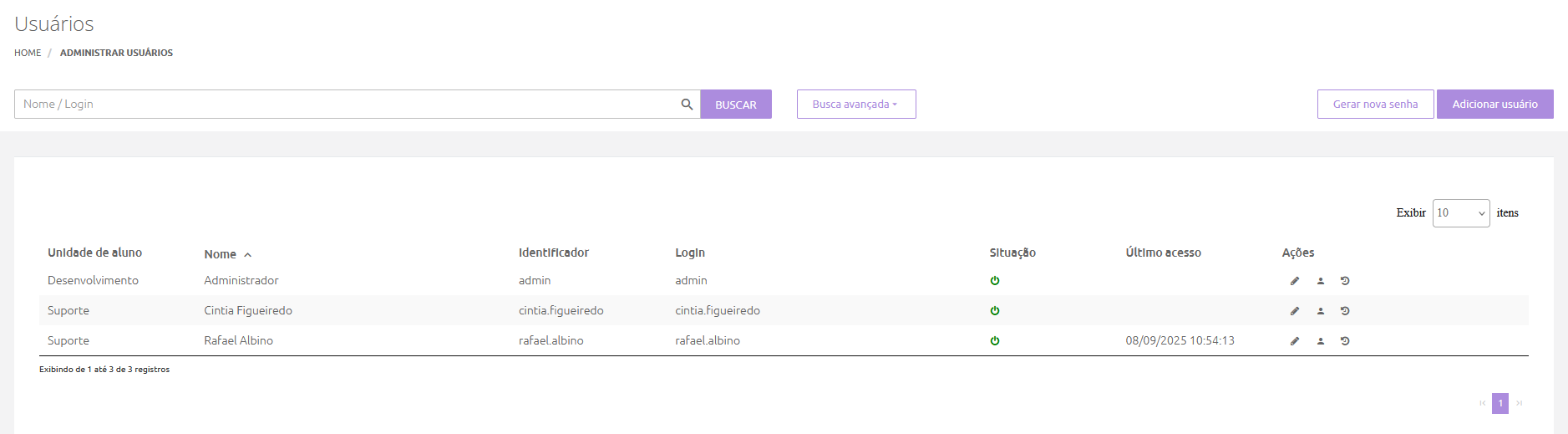Ao acessar o menu Administração > Usuários irá listar todos os usuários cadastrados e com o status ativo no seu ambiente.