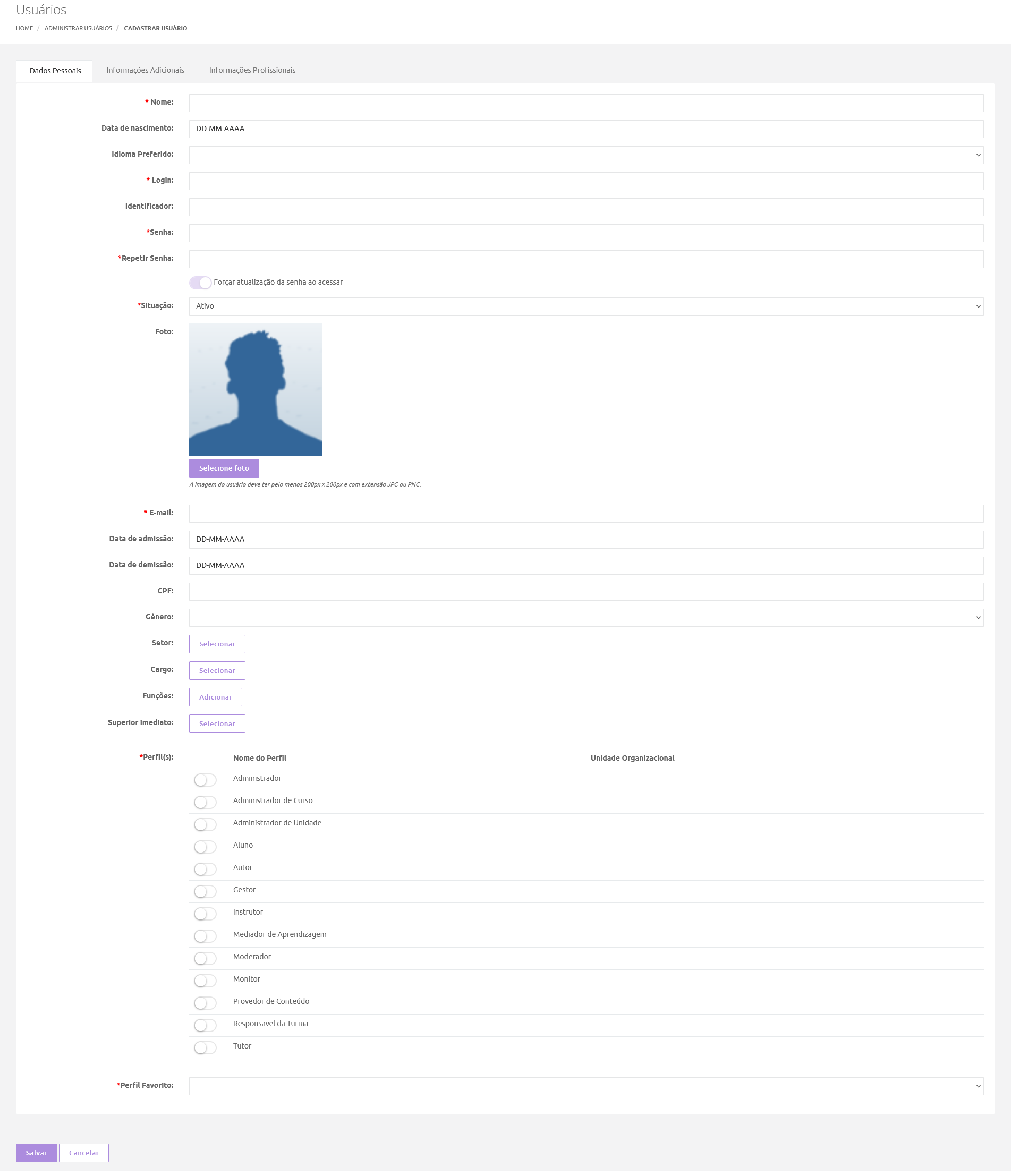 Clicando em "adicionar usuário", permitirá que você visualize os campos possíveis de serem preenchidos. Alguns deles possuem obrigatoriedade de preenchimento, são eles: