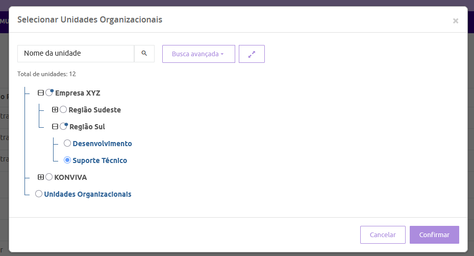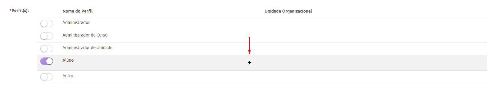 Para associar um usuário a uma unidade na área de configuração de Perfil, selecione o perfil que deseja relacionar ao usuário, aparecerá um ícone de [+] ao lado do perfil que foi selecionado, clique no ícone [+] para associar o usuário a unidade e então clique em "Confirmar".