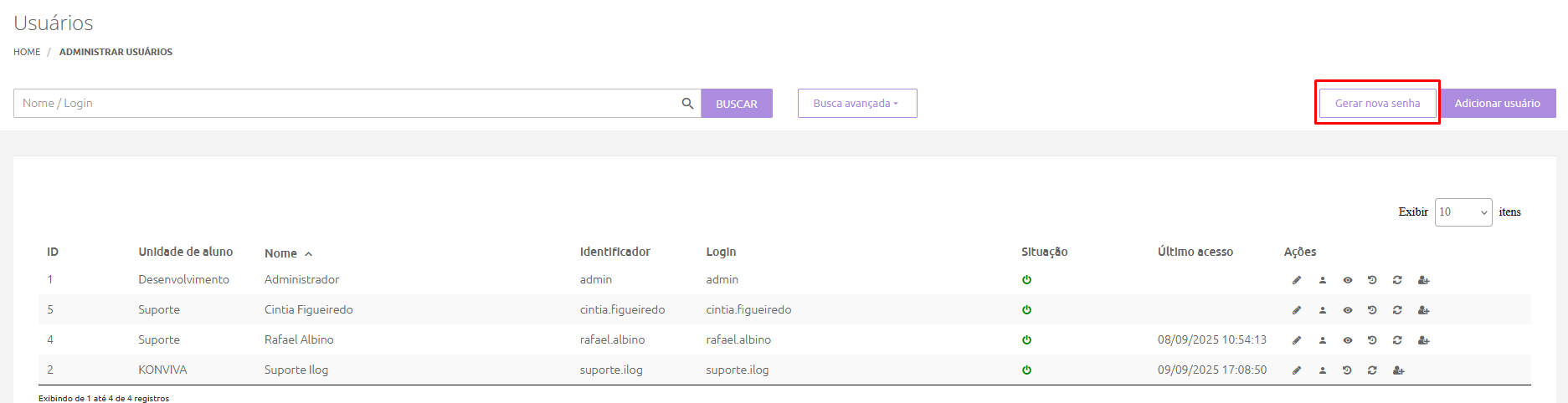 Permite selecionar usuário(s) e gerar nova(s) senha(s) criptografada(s). A senha será enviada aos usuários por e-mail e quem estiver com o status de “Inativo”, o sistema ativará.