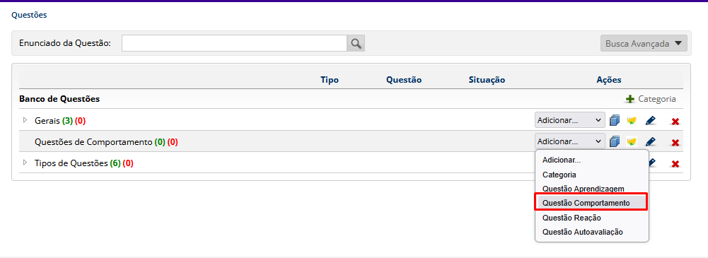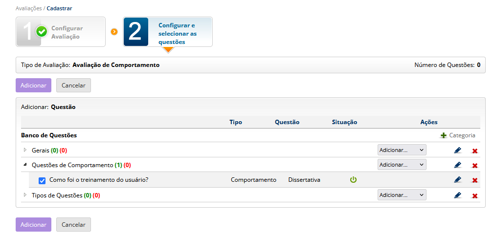 Adicione uma categoria ou utilize uma já existente e selecione o tipo de questão "comportamento".