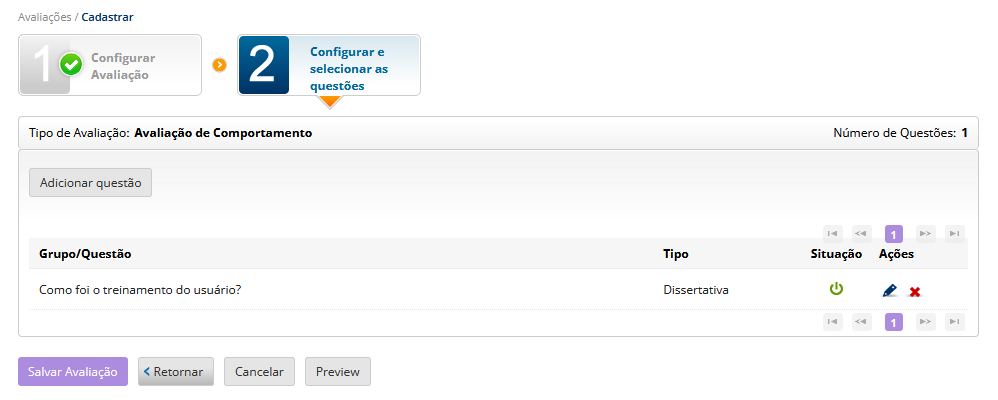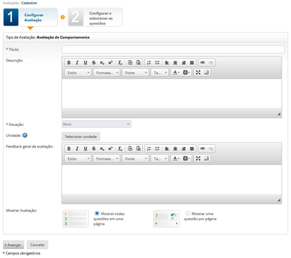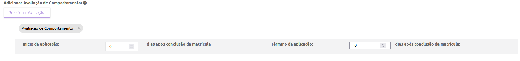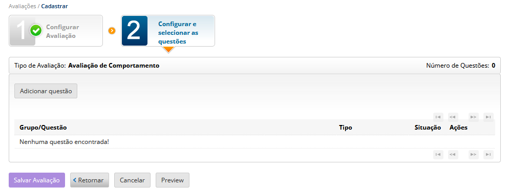E adicione a avaliação no botão "cadastrar" e escolha o tipo "Avaliação de Comportamento" e você será direcionado para a seguinte tela: