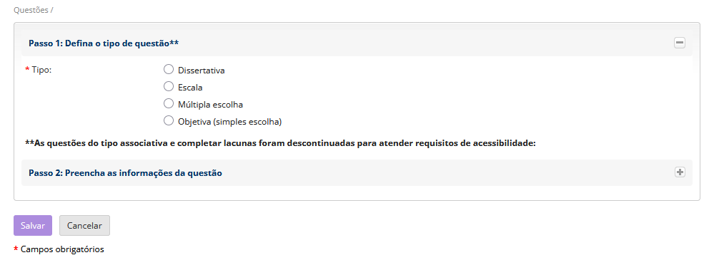 Os tipos de questões que você poderá cadastrar serão os seguintes: