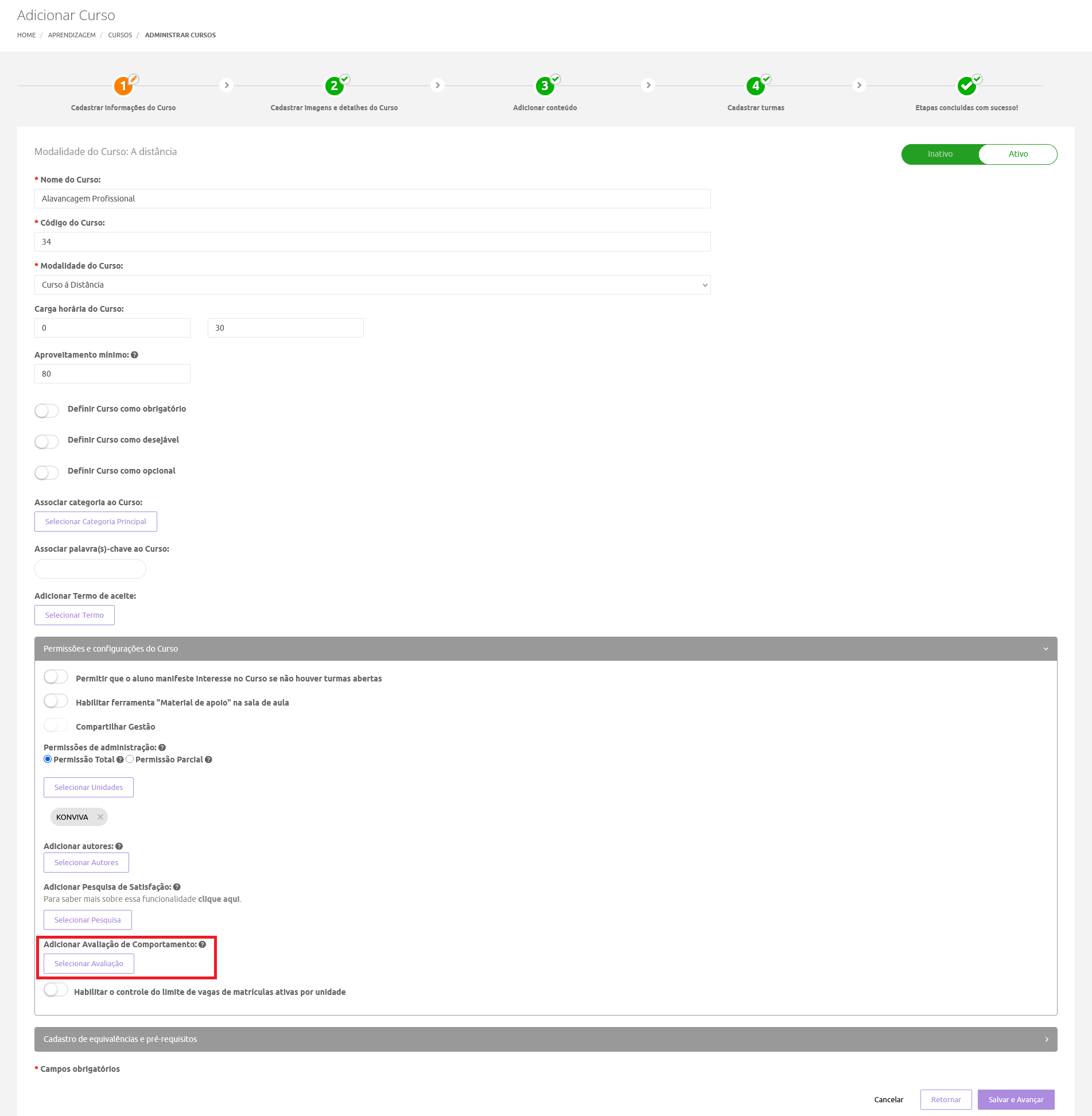 Na página de edição do curso, você deve procurar por "Avaliação de comportamento" conforme a imagem: