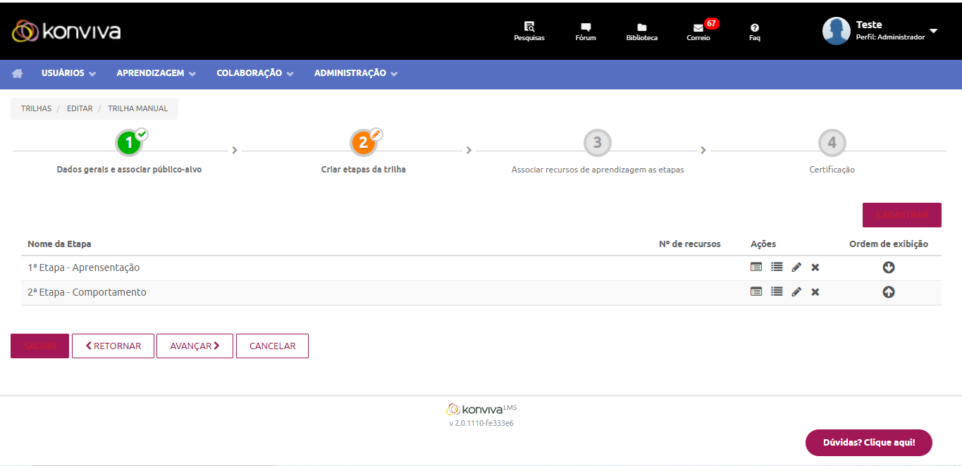 Dando um exemplo prático sobre as configurações de trilha, a figura abaixo ilustra uma trilha composta por 2 etapas, sendo que cada etapa possui 4 cursos associados.