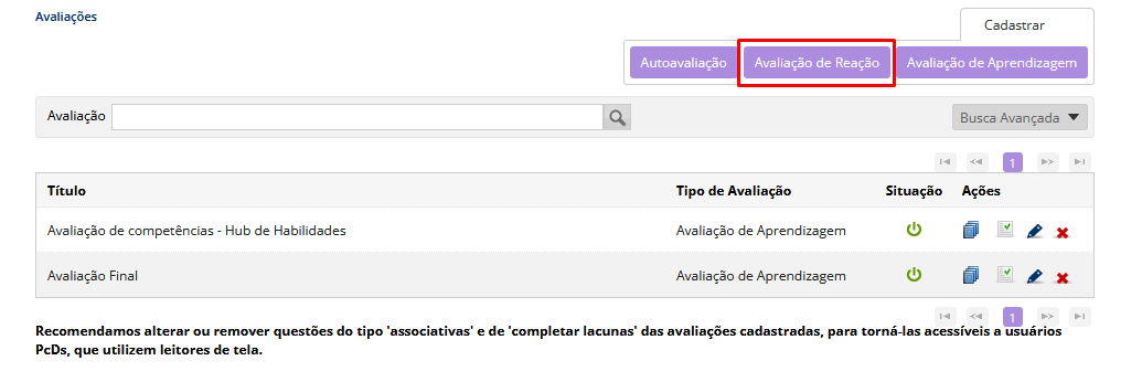 Adicionar avaliação de reação: ao clicar no botão "Selecionar Avaliação", você deve selecionar a sua avaliação já cadastrada no repositório. Ou clique em "Ir para Administrar Avaliações" para realizar a criação da sua avaliação no repositório. Você perderá as ações que tiver registrado até o momento, pois será direcionado para outro menu.