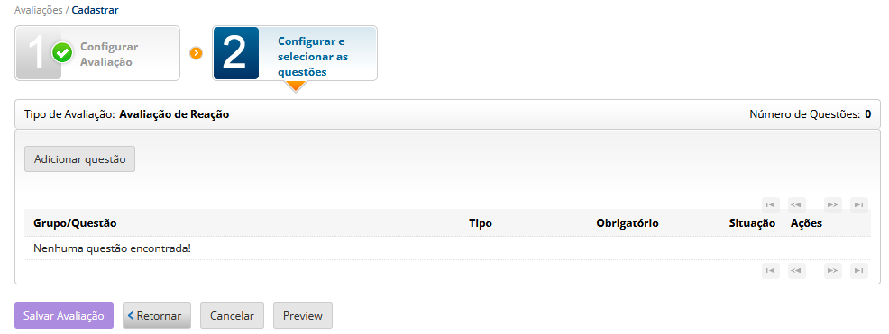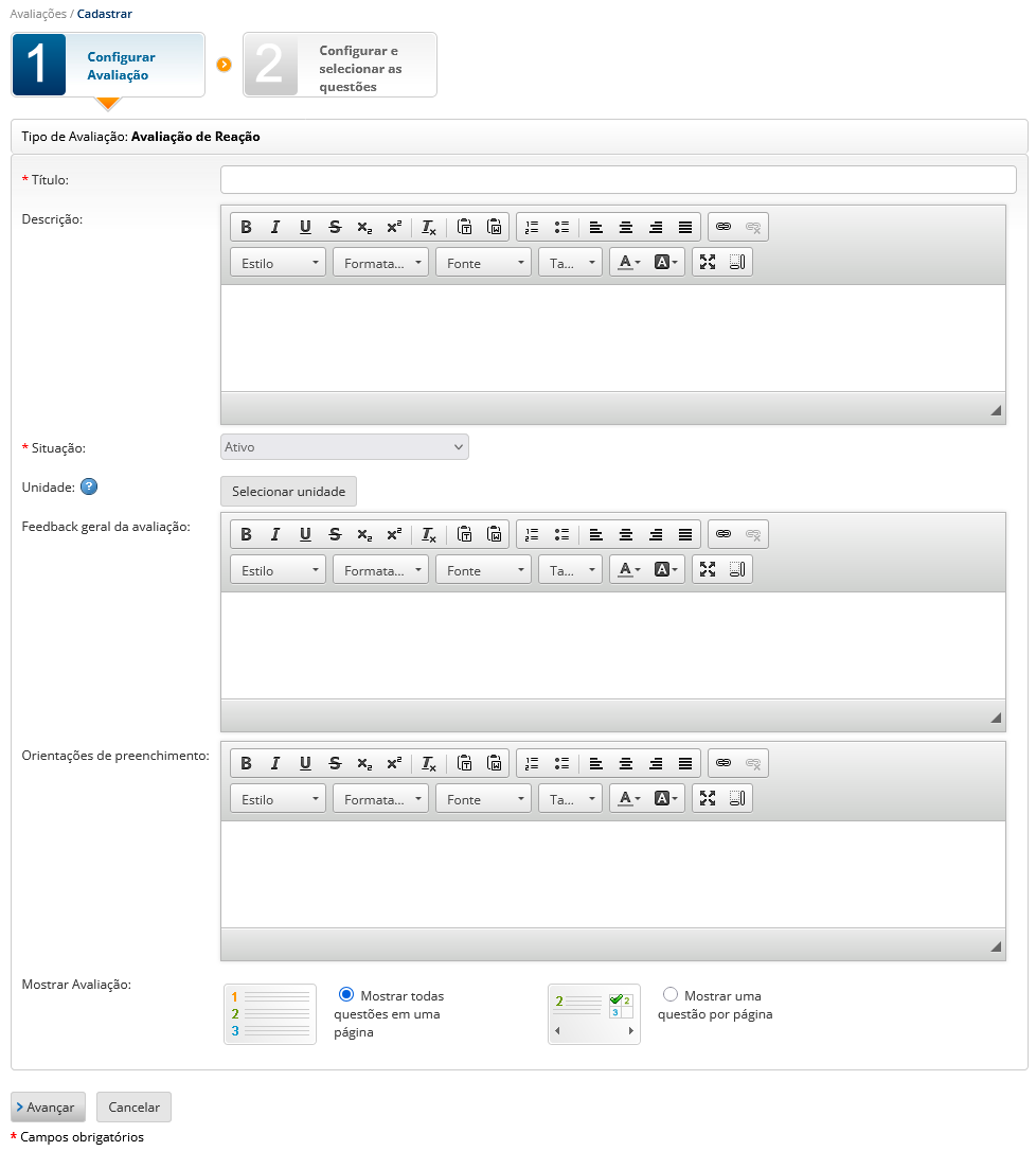 Clicando em "Avaliação de Reação", você será direcionado à primeira etapa do cadastro de avaliação.