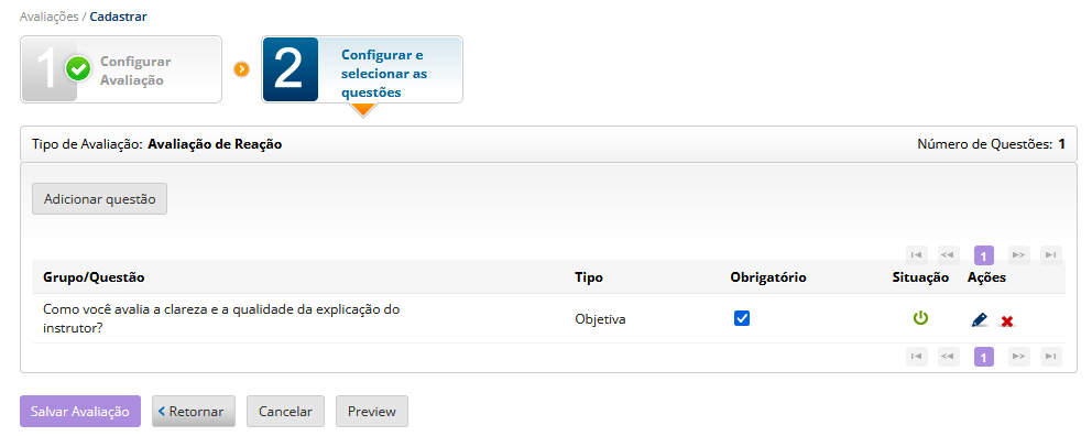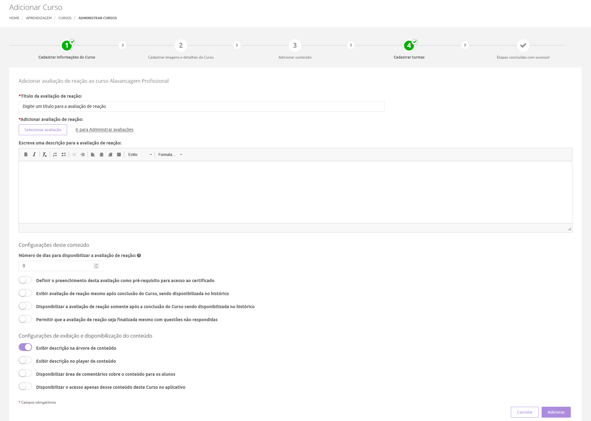 Para adicionar a avaliação de reação em um curso, ela já deve estar cadastrada no repositório.