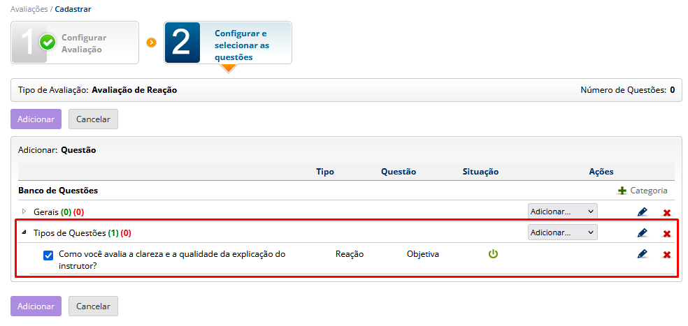 Tendo feitas todas as configurações necessárias, clique no final da página em "adicionar", e sua avaliação de reação estará associada ao curso.