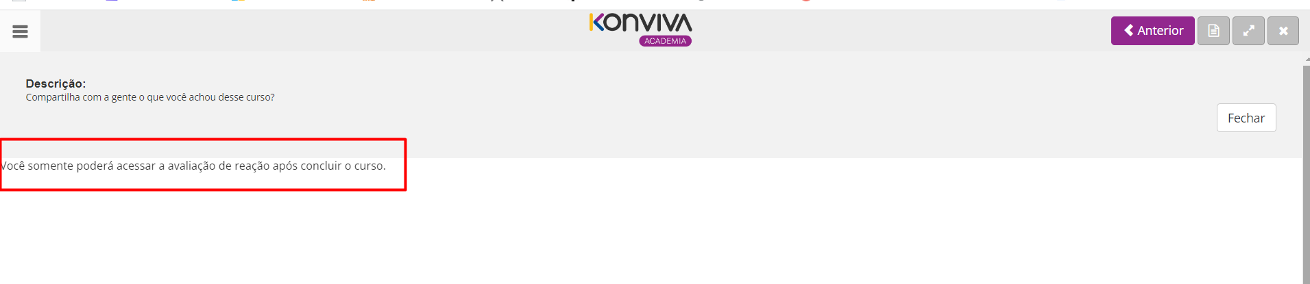 Disponibilizar a avaliação de reação somente após a conclusão do curso sendo disponibilizada no histórico: avaliação será disponibilizada para o aluno somente após a finalização do curso. O aluno conseguirá visualizar a avaliação na sala de aula, mas quando clicar nela, aparecerá a seguinte mensagem: