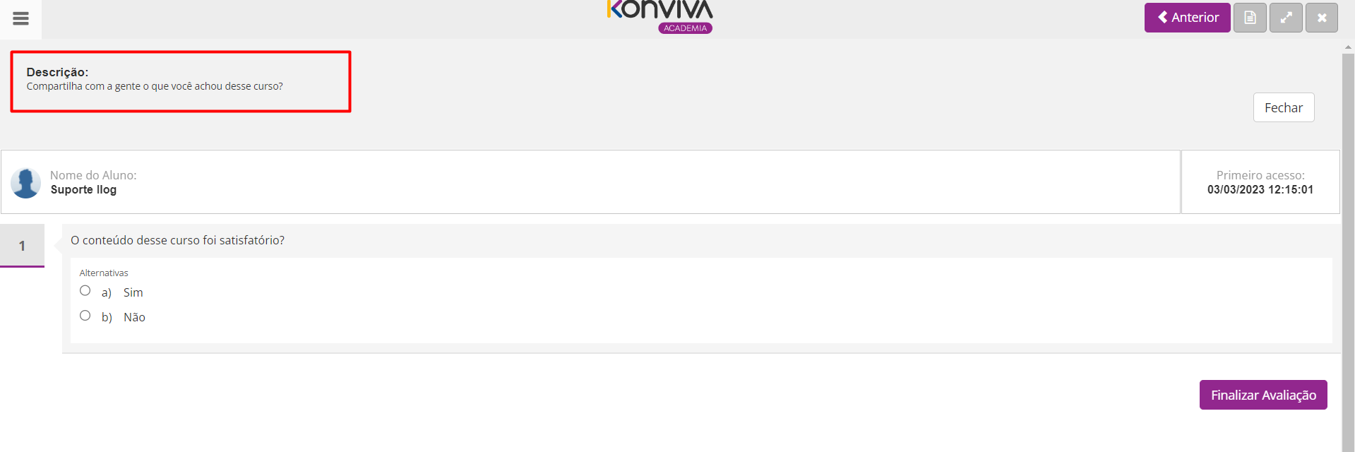Exibir descrição no player de conteúdo: essa mesma descrição também pode ser configurada para aparecer para o aluno no player, ou seja, no momento em que ele está respondendo essa avaliação na sala de aula.