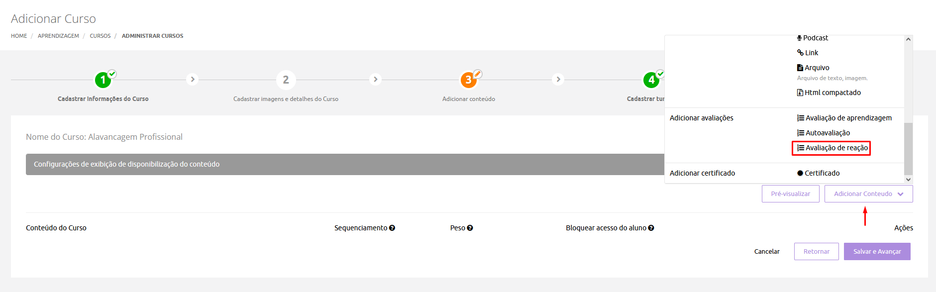 Vá até o botão "Adicionar Conteúdo" e selecione "Avaliação de Reação".