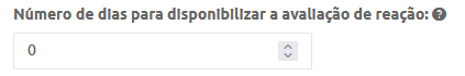 Número de dias para disponibilizar a avaliação de reação: você pode escolher disponibilizar a avaliação de reação para o aluno dias depois da conclusão do curso. Para isso, basta preencher no campo que fica abaixo da configuração, quantos dias após a conclusão gostaria que fosse disponibilizada. Permanecendo zero, assim que o aluno finalize o curso, ele já poderá respondê-la.