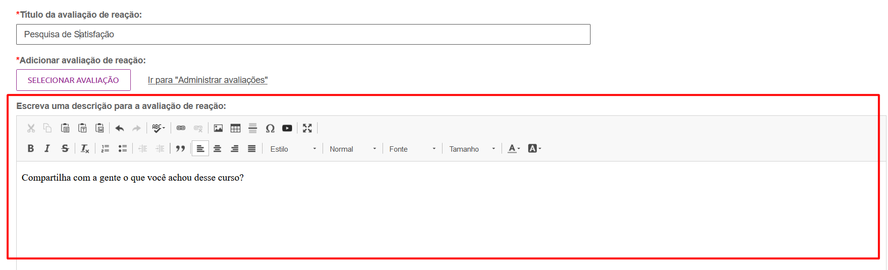 Escreva uma descrição para a avaliação de reação: você pode inserir uma descrição da sua avaliação com informações para os alunos, que poderá aparecer na árvore dos conteúdos ou no player do conteúdo.