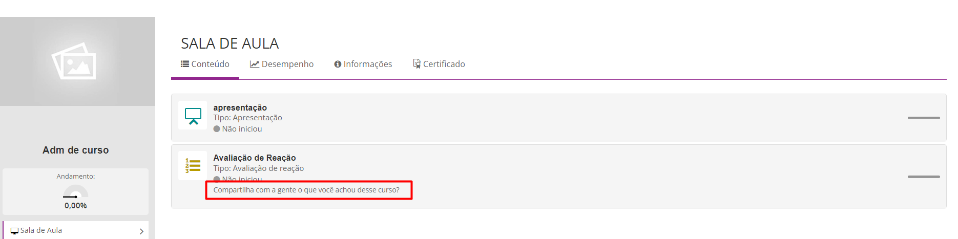 Por padrão, é possível adicionar somente uma avaliação de reação por curso. Caso você precise utilizar mais de uma, você deve entrar em contato com o Suporte para habilitar esta função no seu configurador geral.