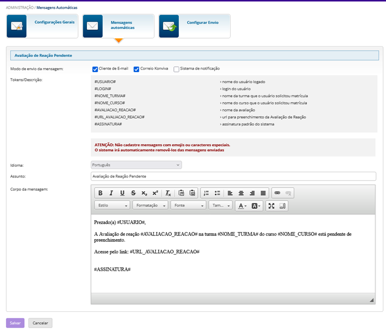 Comunicação → Notificações do Sistema → Mensagens Automáticas → Guia “Matrícula” → Avaliação de Reação Pendente