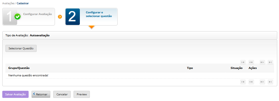 Você deverá clicar no botão "Selecionar Questão" e você será encaminhado para o banco de questões para selecionar a questão que comporá a autoavaliação.